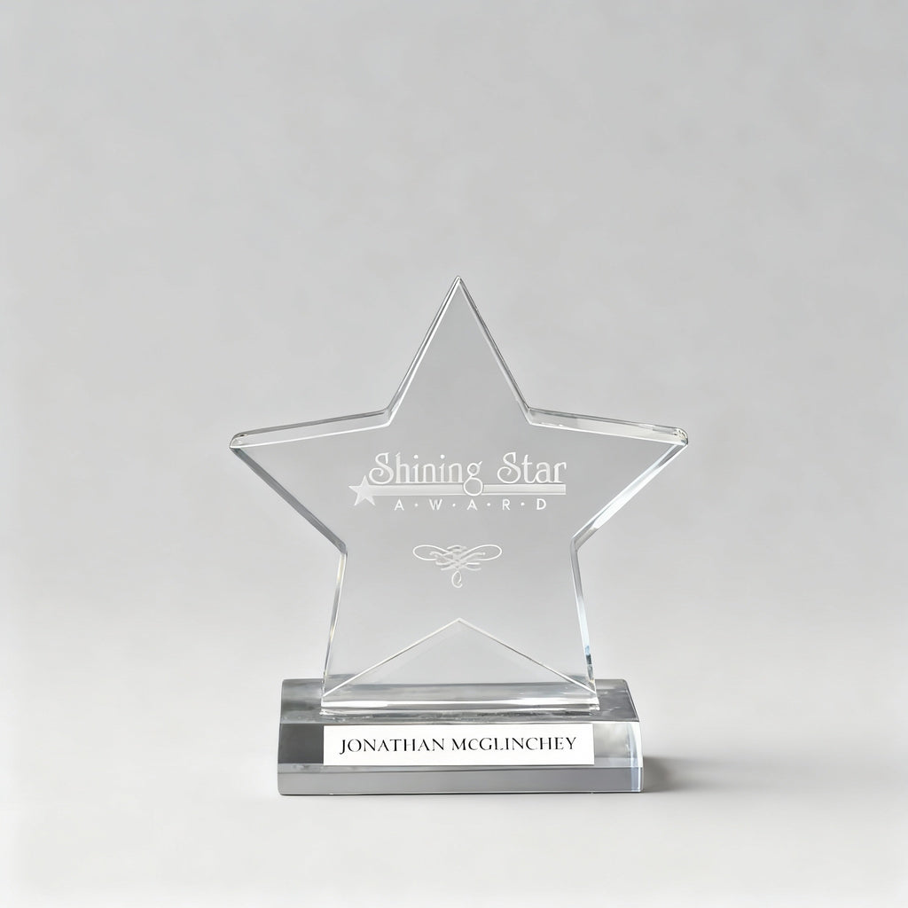 Clear Acrylic Star on Base. Honor extraordinary achievement with this laser engraved award of classic design. This acrylic is perfect to highlight Appreciation and Recognition awards.