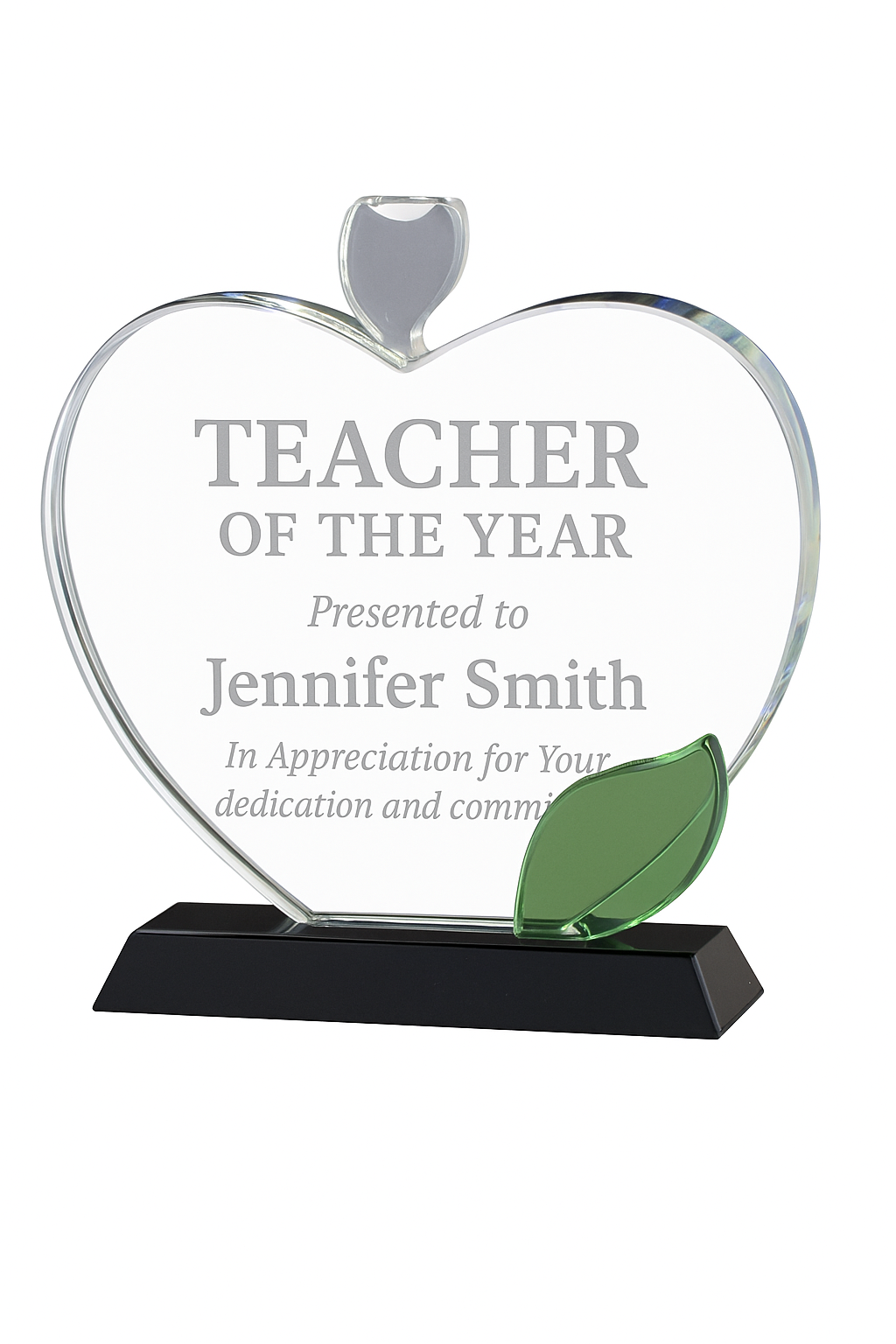 An Elegant Clear Crystal Apple with Green Crystal Leaf on a Black Crystal Base. Fully Laserable and Includes Deluxe Velour Lined Presentation Box