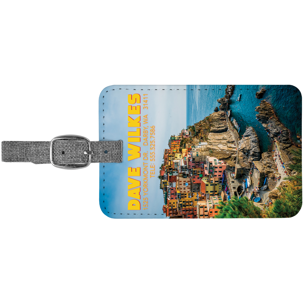 Ideal for giving as a gift, offering incentives, or using as promotional items, this luggage tag measures 2 ¾” x 4 ¼” and has the appearance and texture of genuine leather at a fraction of the price. Personalize it with your logo, monogram, or other graphics for a sleek black contrast, and enjoy a polished finish with top-stitching along the edges. Each tag comes with a leatherette strap and a white paper insert, conveniently packaged in a black gift box for a stylish presentation.