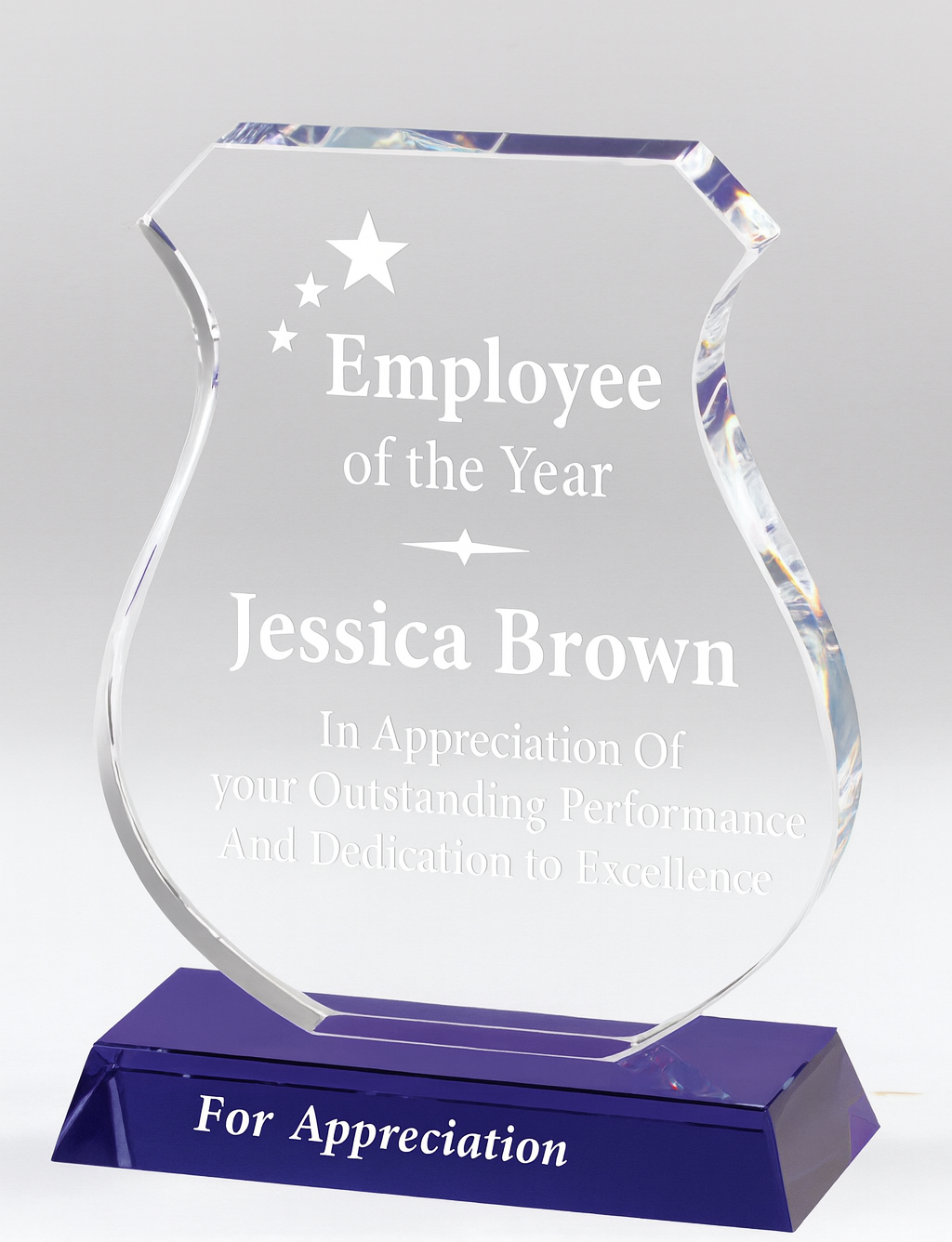 Our Crystal Police Badge Award features a clear piece of crystal in the shape of a police badge. The clear piece if for laser engraving personalization and it’s mounted on a blue crystal base. This crystal award comes packaged in a satin lined deluxe gift box.
