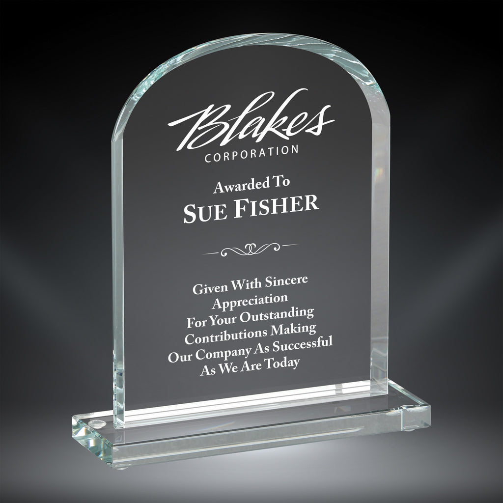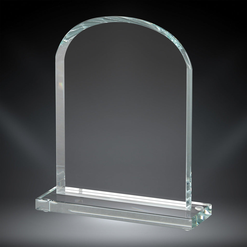 Sophistication and an elegant appeal are the highlights of this line of Radiant Glass Dome Awards. The top is beautifully rounded giving it the "Dome" appearance while crisp clean edges form a large personalization area can be either sandblasted or laser engraved and will accommodate just about any of your recognition needs. Sitting atop a matching glass base this product is available in three different sizes 6 1/2" X 5" X 2", 8" X 6 1/2" X 2" and 9"X 7 1/4" X 2" giving you plenty of option for your next awards ceremony. These glass awards would make anyone proud to either give or receive.